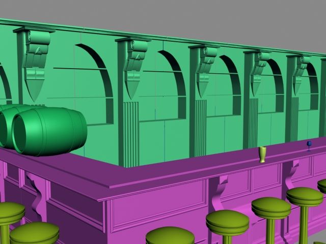 After talking to a friend of mine and discussing the designs I'm working on he wanted to see the pub in textures. I told him I didn't want to do that till I got the main bar area done to give a complete scene to look at. He recommended that I at least give the basic texture colors the proper colors to be used in the actual design. I thought that was a goo idea just to see the basic colors.